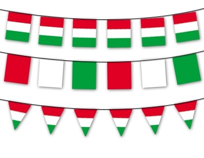 Kiváló reklám, vagy dekoráció eszköz. A zászlók hőollóval téglalap alakúra vannak vágva, két méterenként 5 db zászló kerül a szalagra. A zászlók 20 cm térközzel kerülnek felvarrásra.